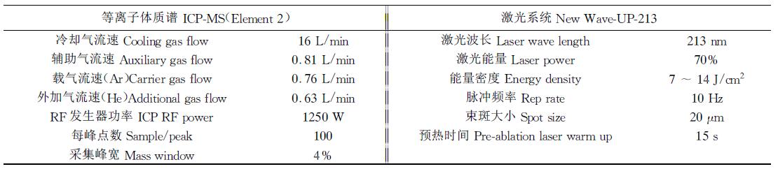 石盐流体包裹化学组成的测定由国家地质实验测试中心完成,采用激光剥蚀ICP_MS法,使用 Elem ent 2型等离子体质谱仪(德国Finnigan公司)与UP 213型激光器(New Wave 公司)(表1) 。激光 波长为213 nm,脉冲宽度为4 ns。在激光剥蚀采样条件下,采用高纯氦气作为剥蚀物质的载 气,以优化剥蚀和传输效率。实验中作用于样品的实际能量控制在0.03~0.06 mJ,剥蚀 能 量密度控制在7~14 J/cm2。采用点剥蚀模式,每个分析点的气体背景采集时间约为15 s ,信号采集时间为60 s,ICP_MS信号测量控制60次/分钟。