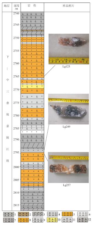 图 1长平3井嘉陵江四段岩心柱状简图及样品岩芯照片