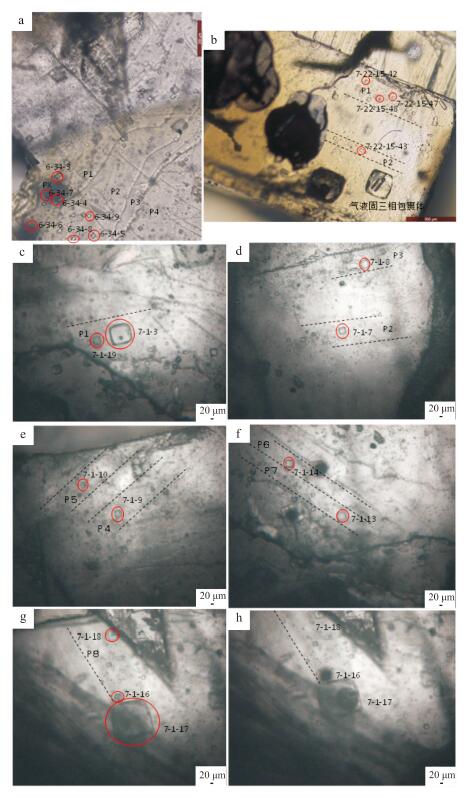 a. Sample Lg123; b. Sample Lg249; c~h. Sample Lg257; g. Photo of fluid inclusio n (7_1_16) before laser ablation; h. Photo of fluid