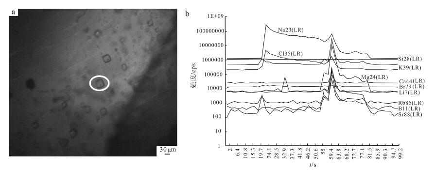 Fig. 3The fluid inclusion in halite (a) and MS signal intensity vs. time for s ingle fluid inclusion in halite (b)