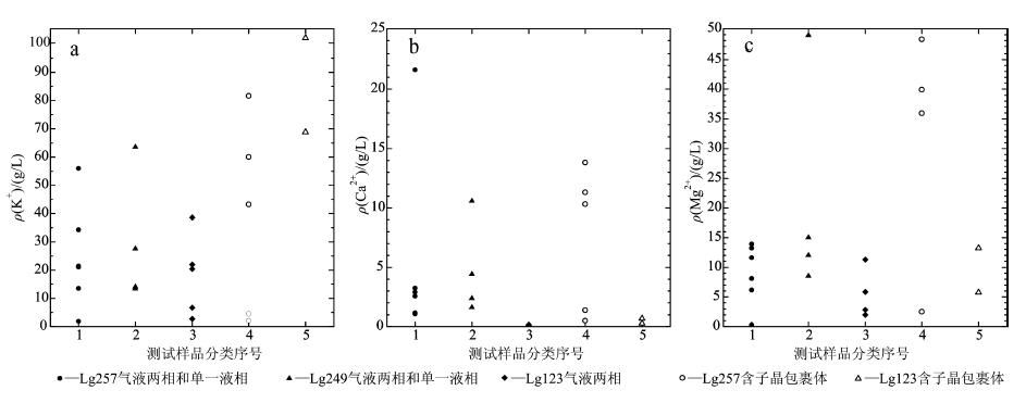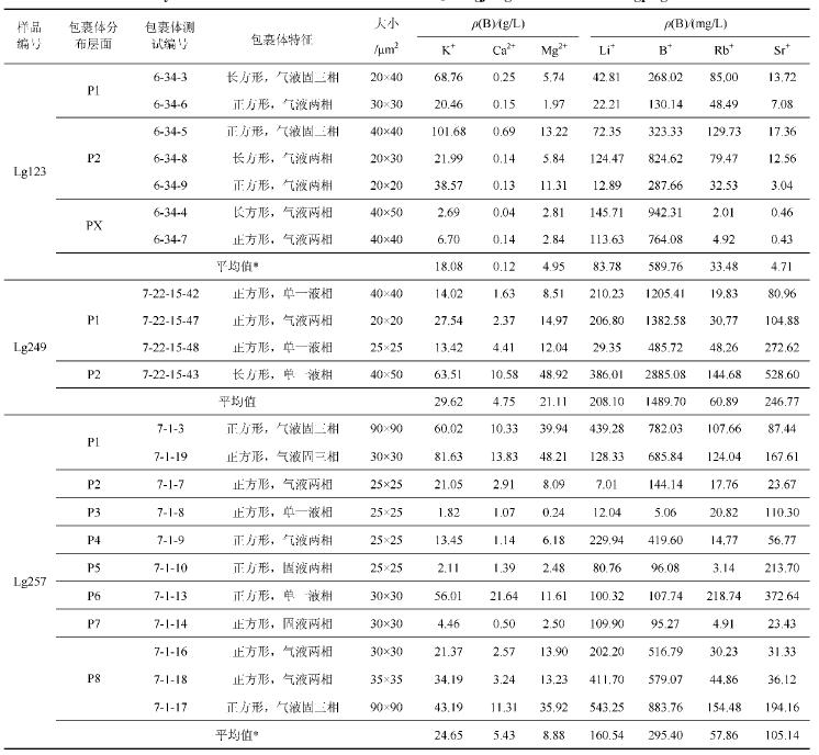 分析结果还显示,同一样品的不同流体包裹体 化学组分变化较大(图4、表2),根据包裹体岩相学 观察可知,所测试包裹体处于不同的石盐晶体面P1~PX(图2)。样品Lg123包裹体中 ρ (K+)为2.69~38.57 g/L(剔除含子晶包裹体的数据,下同),包裹体分布于3个 晶面上,其中P2晶面上2个气液两相包裹体(6_34_8和6_34_9)的ρ(K+)、 ρ(Mg2+)等接近,PX晶面上2个流体包裹体化学组成分比较接近。Lg249包裹 体 中ρ(K+)为13.42~63.51 g/L,Lg257包裹体中ρ(K+)为1.82 ~56.01 g/L,处于同一晶面上的包裹体化学组分变化较小,而不同晶面上包裹体组分变化 较大。