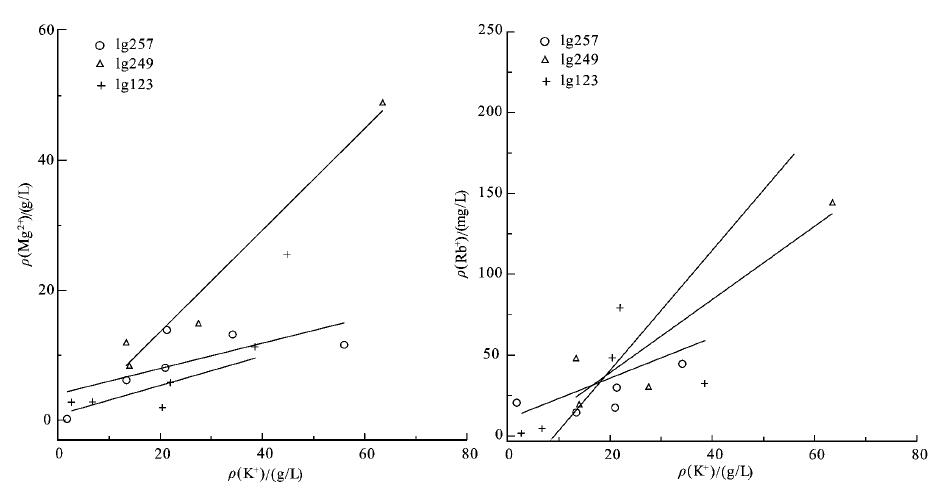 图 5石盐流体包裹体钾含量与镁、铷含量的关系