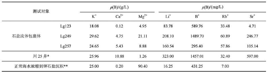 表 3石盐流体包裹体成分与川25井、黄海海水浓缩到钾石盐沉积时期卤水成分对比