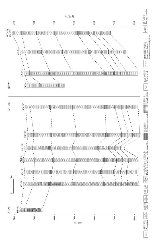 根据对矿区内数口打穿含盐系的钻孔(如ZK121、ZK181、ZK201等)详细岩芯编录可知,Apt ian阶盐类几乎直接沉积在陆相裂谷期碎屑岩之上。盆地内蒸发岩段总体呈石盐岩和光卤 石岩互层,其间夹多层碳质页岩,局部发育(含水氯镁石)溢晶石岩和次生钾石盐岩。岩芯编录所获得的钻孔资料,从宏观范围上看,整个蒸发岩系只有一个成盐期,作为Ⅰ级 韵律(沉积旋回)。根据次一级的淡化—浓缩—淡化的变化,进一步划分Ⅱ级韵律。以各韵素 之间的不同咸化、淡化组合,划分出Ⅲ级韵律。