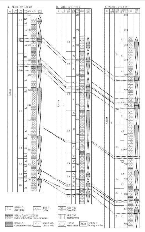 在矿区北部、中部和南部各选取1个钻孔(北部ZK101(图5a)、中部ZK03(图5b)、南部 ZK201(图5c))进行沉积韵律对比,详细研究岩盐沉积韵律的变化。从图5中可以看出,北 部 岩盐埋深较浅,南部岩盐埋深较深,说明岩盐开始沉积时,盆地底部有较小倾角的坡度。3 个钻孔岩盐韵律均显示以下特征,Ⅱ1、Ⅱ6和Ⅱ7比较相似,底部均为碳质页岩(夹石 盐岩 或石膏岩),向上为厚层石盐岩,再到光卤石厚层,最上部为薄层光卤石岩与石盐岩互层。 Ⅱ4和Ⅱ5比较相似,都是底部为碳质页岩,向上为石盐岩,再过渡到石盐岩与光卤石岩互层 ,最顶部沉积(含水氯镁石)溢晶石岩。不同的是Ⅱ5比Ⅱ4厚,且上部沉积有厚层的光卤石 岩。Ⅱ2和Ⅱ3比较相似,底部为碳质页岩(夹光卤石岩或石盐岩),上面为薄层石盐岩与光 卤石岩互层。3个钻孔岩盐韵律的差别在于,ZK201钻孔Ⅱ4旋回顶部缺乏(含水氯镁石)溢 晶石岩(图5c),与ZK101(图5a)和ZK03(图5b)相异,可能是因为Ⅱ4旋回沉积时,ZK20 1钻孔位置靠近盆地中心或海水灌入通道,致使水体蒸发浓缩析出,且蒸发岩程度不及矿区 中部和北部。对出现的韵律和厚度进行分析,各Ⅱ级韵律均表现为不对称式,即淡化期短 ,向上迅速咸化浓缩。析钾期水体的浓—淡变化,体现在石盐岩和光卤石岩的交互沉积,而 且各Ⅱ级韵律间光卤石单层及累积厚度均有所不同。主矿层主要分布在Ⅱ1、Ⅱ2、Ⅱ5、Ⅱ6 和Ⅱ7(图5)。其中,Ⅱ1、Ⅱ6和Ⅱ7韵律段矿层较厚且稳定,厚度约10~20 m;Ⅱ2和 Ⅱ5的主矿层较薄,厚度约5 m,且部分边部钻孔缺失(如ZK101,图5a)(据栾元滇等 ,2015)。