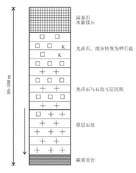 盐岩段主要由石盐岩、光卤石岩、溢晶石岩、钾石盐岩等组成。厚度250~900 m 。