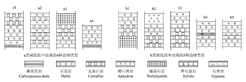 将最小的单层岩性作为一个韵素,研究层段的主要韵素有硬石膏岩、石盐岩、光卤石岩、( 含水氯镁石)溢晶石岩、钾石盐岩等。在Ⅱ级沉积旋回划分的基础上,根据单个或数个岩性 相近的韵素在剖面上的不同组合划分出不同的Ⅲ级韵律。具体划分出以下淡化类(a类)和 咸化类(b类)盐韵律。图7分别列出了各盐韵律,每个盐韵律相当于1个Ⅲ级韵律。a类(咸化段中的盐韵律)在咸化段中出现,包括4种类型,即a1、a2、a3、a4( 图7)。a 1为碳质页岩(夹石膏岩或与石膏岩互层)_石盐岩_光卤石岩,一般出现在蒸发岩地层的底 部,是岩盐沉积的最开始阶段;a2为石盐岩_光卤石岩互层沉积,本韵律在整个盐类沉积过 程中均可见,单个薄层的厚度从0.1 m至几m不等;a3为石盐岩_光卤石岩_(含水氯镁石) 溢 晶石岩,一般出现在每个二级旋回的顶部,代表该旋回的后期沉积特征;a4为碳质页岩_硬 石膏岩_石盐岩,代表一个正常速率的咸化沉积,属于某沉积旋回的开始阶段。与a1相比, 出现了硬石膏岩这一韵素,反映较缓慢蒸发浓缩的盐韵律类型。而a1由碳 质页岩直接过渡到石盐岩,反映快速蒸发浓缩的盐韵律类型。
