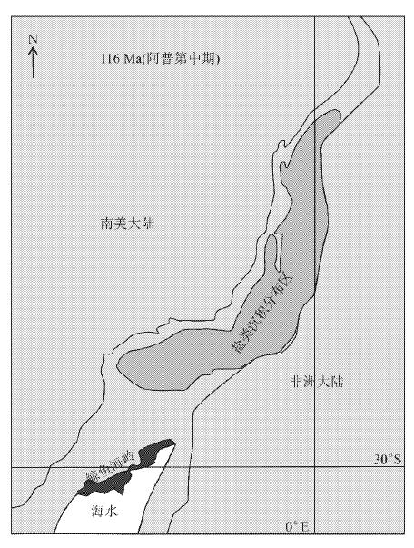 晚Aptian期—早Albian期,西非结束裂谷阶段,初始洋壳开始形成,海水灌入盆地。南侧鲸 鱼海岭(Walvis Ridge)呈岛或浅礁(Evans,1977),对海水起到阻挡作用(图8),导致西 非裂谷盆地海水易进难出。经过多次海侵,加之气候干旱,盆地内水体强烈蒸发,在西非、 南美边缘广泛沉积 了厚层蒸发岩(Jackson et al.,2000),也称“阿普特盐盆地"(Aptian Salt Basin)(图8) 。 鲸鱼海岭(Walvis Ridge)作为隔挡,形成封闭_半封闭环境,对下刚果盆地岩盐的沉积 也具有重要的作用。白垩纪中期,西非地区气候炎热干燥(Fluteau et al., 2007;Scotes e et al., 1999),有利于蒸发作用的进行。