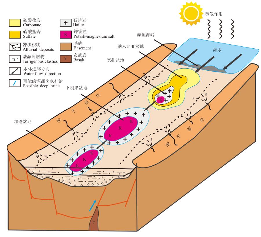 白垩纪时期,大西洋裂谷开始形成、打开,形成了包括下刚果盆地在内的一系列裂谷盆地; 同时,伴随强烈火山活动,以及海水灌入,大量钾、钠等盐类组分进入盆地;此时,正值白 垩 纪温室气候的高温气候期,海水经强烈蒸发析出石膏后,形成富钾卤水,迁移至裂谷中最深 的次级盆地即下刚果盆地,进一步浓缩形成光卤石矿层。综合下刚果裂谷盆地钾盐矿床特征 及其各方面成矿要素,总结归纳出其钾盐沉积模型(图9)。