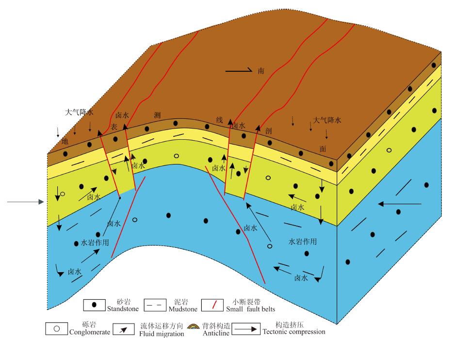 图 1卤水沿断裂上升示意图(据Bo et al.,2014) Fig. 1Brine migration through fault belts(after Bo et al.,2014) |