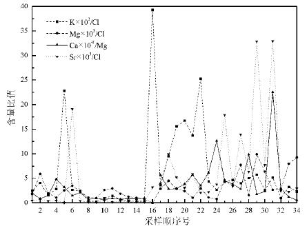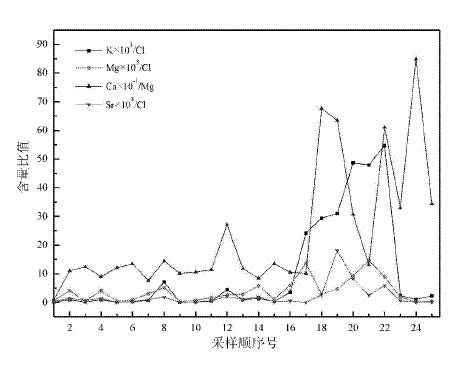 克孜尔北部测线剖面钾氯比值在4号、16号(最高值39.250)及19~22号样点有高峰值;镁 氯比值(Mg×103/Cl)范围为0~9.892,呈现多个峰值;钙镁比值(Ca×103/Mg)在2 4、28、31号样点处出现高峰值,在4号、17号、21号样点也相对较高;锶氯比值(Sr×10 3/Cl)有7个峰值,分别为6号、18号、21号、25号、27号、29号、31号。