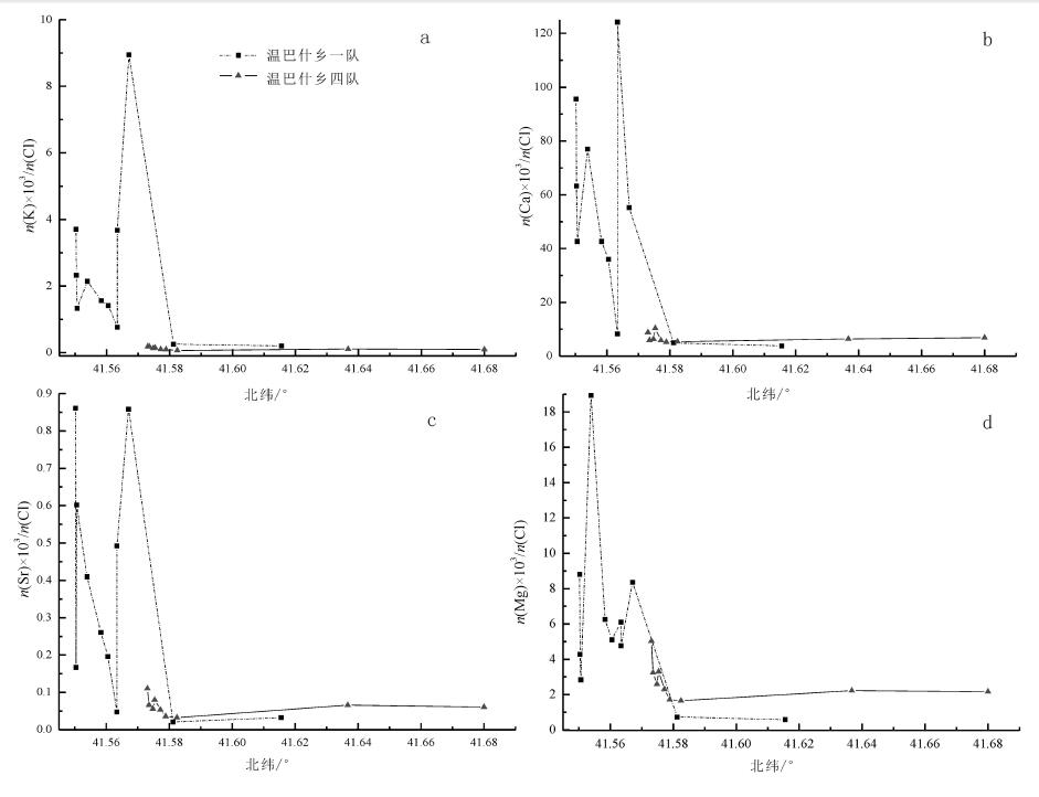 图 4温巴什南冲沟卤水样品元素含量比值变化 a. 钾氯比值; b. 钙氯比值; c. 锶氯比值; d. 镁氯比值 Fig. 4Distribution of element content ratios for brine samples from the gully of southern Wenbashi a. Potassium to chloride ratios; b. Calcium to chloride ratios; c. Strontium t o chloride ratios; d. Magnesium to chloride ratios |