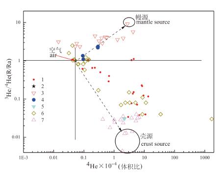 图 5中国部分地区稀有气体4He与R/Ra关系图 1—兰坪—思茅盆地盐泉/温泉气; 2—空气; 3—腾冲温泉气; 4—罗布泊地下卤水气 体; 5—库车盆地地下卤水气体; 6—河西走廊温泉水气体; 7—塔里木盆地天然气 Fig. 5The diagram of 4He versus R/Ra for noble gases from some places of China 1—Escaped gas samples from (saline) springs of the Lanping-Simao Basin; 2—Air ; 3—Escaped gas samples from springs of Tengchong, Yunnan; 4—Escaped gas samp les from underground brines of Lop Nur, Xinjiang; 5—Escaped gas sampl es from underground brines of Kuqa Basin, Xinjiang; 6—Escaped gas samples from springs of the Hexi Corridor; 7—Natural gas samples from the Tarim Basin |