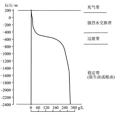 吴必豪等(19 96)总结国内外资料,认为卤水在地下水圈中广泛分布,卤化物型或氯化钙型水位于下 部稳定带(原生卤或根卤),其矿化度随深度缓慢增长(图6)。