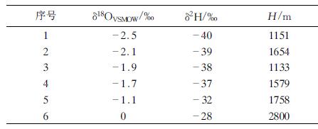 据报道,欧洲大部分地区δ18O同位素高程梯度为0.2‰~0.3‰(张东等,2004), 于津生等(1980)对中国川、藏、黔一代大气降水同位素组成与地形高程关系进行了研究, 得出该地区大气降水δ18O的梯度值为-0.0026‰,同时得到相应的一元回归方程: -δ18O=0.0026H+7.75。本研究中获得的研究区大气降水与高程数据相对较少 ,短时间内难以直接获得各研究区的经验公式,因此,目前只是根据已有数据对该经验公式 进行背景校正,然后用来推算盐泉、卤水的补给深度。