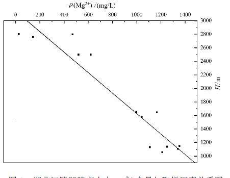 通过湖北江陵凹陷钻孔卤水各组分与深度对比分析后发现,Mg2+、Ca2+、Sr 2+、SO2-4含量与补给深度有关,其中,Mg2+与深度呈很好的负相关关 系,相关系数r=-0.9493,线性关系方程为y=-0.5959x+1957.6(图8, 数 据来自课题组内部资料)。可以利用该线性方程,根据卤水中Mg2+含量来估算该 地区卤水的补给深度。