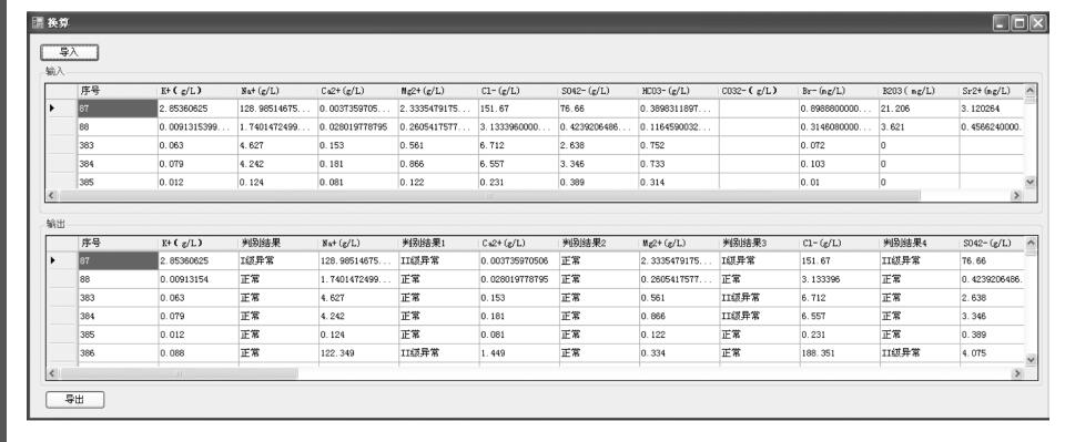 此外,本研究专门设计了水化学异常指标判别 小程序(图10),导入指定格式的原数据后, 即可获得相关水化学特征系数值、水化学类型、水化学组分和特征系数判别结果。根据软件 判别的结果,可以进一步锁定异常区和异常点,结合地质资料和已经获得的水化学分布图, 缩小找钾靶区。在新疆库车盆地和云南兰坪思茅盆地找钾靶区预测实践中(伯英等,2014; 2015),已证实异常判别软件的使用,可以大大提高数据处理、异常点识别和水化学类型判 别的速度。