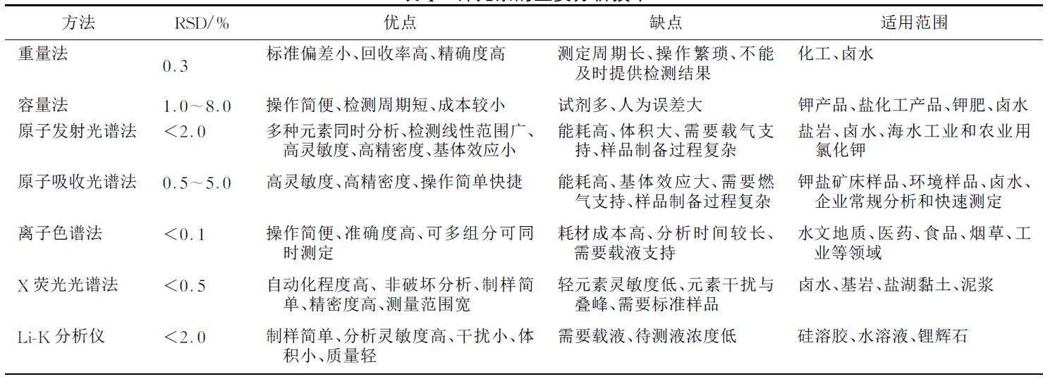 随着科学的进步,元素的定性与定量分析技术方法越来越多,检测技术水平不断提高,支撑 钾盐资源的勘查与研究能力越来越强。目前,钾元素的主要分析技术包括重量法、容量滴定 法等传统化学方法,以及X射线荧光光谱法(XRF)、原子吸收光谱法(AAS)、原子发射光 谱法(AES)等现代仪器分析法(表1)。上述方法虽然都具有优良的检出限或精密度等指标,但是传统的化学分析方法检测周期 长,并且操作繁琐,难以实现快速获得分析数据的目的,而原子发射光谱法、原子吸收光谱 法、火焰光度计法、离子色谱法等需要优质、稳定的运行环境,需要载气、燃气等辅助气体 或载液的支持,并且能耗高,均达不到 野外现场快速分析的要求。因此,为了满足现代钾盐勘探工作中的需要,研发野外快速检测样品中钾元素的分析技术成为一项紧迫的任务。