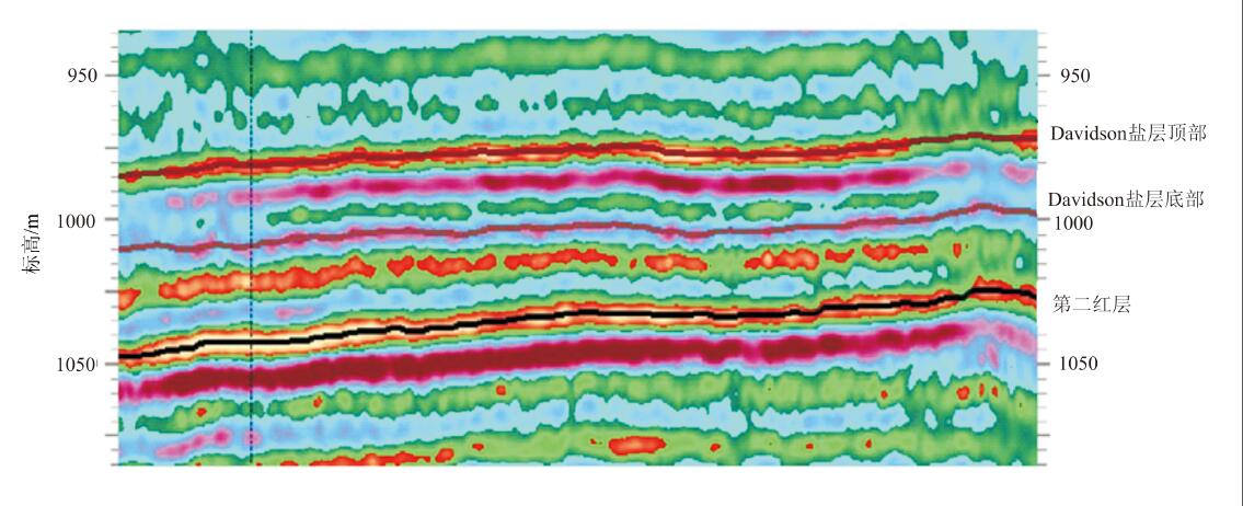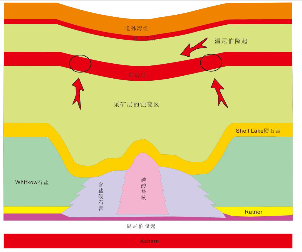 草原组蒸发岩底部为无水石膏或碳酸盐岩组成的道森湾组。二维地震可以显著识别反射明显 的 界面,矿区内:温尼伯隆起、草原组蒸发岩和顶部的层状硬石膏,具有较强的信号反应,而 钾盐矿层在2D信号中无法识别,在识别上,用草原组蒸发岩的特征代替矿层。