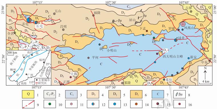 图 1广西西大明山区域地质及矿产分布图 1—第四系沉积物; 2—中石炭统—下二叠统灰岩; 3—下石炭统灰岩; 4—上泥盆统灰岩 、白云岩; 5—中泥盆统白云岩、灰岩; 6—下泥盆统 砂岩、泥岩、灰岩; 7—寒 武系 砂岩 、泥岩; 8—辉绿岩; 9—断层; 10—锑矿; 11—银矿; 12—铅锌矿; 13—铅矿; 14 —金矿; 15—钨铋矿; 16—锰矿 Fig. 1Regional geology and mineral distribution of Xidamingshan area, Guangxi 1—Quaternary sediments; 2—Middle Carboniferous_Lower Permian lim estone; 3—Lower Carboniferous limestone; 4—Upper Devonian limestone and dolomi te; 5—Middle Devonian dolomite and limestone; 6—Lower Devonian sandstone, muds tone and limestone; 7—Cambrian sandstone and mudstone; 8—Diabase dike; 9—Faul t; 10—Sb deposit; 11—Ag deposit; 12—Pb_Zn deposit; 13—Pb deposit; 14—Au dep osit; 15—W_Bi deposit; 16—Mn deposit |