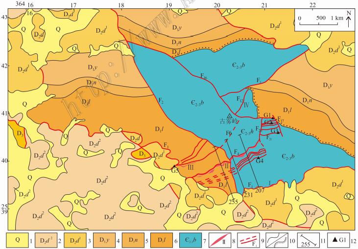 图 2弄屯铅锌矿床地质简图(据广西壮族自治区第四地质队,2013修改) 1—第四系松散沉积物; 2—中泥盆统东岗岭组上段灰岩; 3—中泥盆统东岗岭组下段白云 岩; 4—下泥盆统郁江组砂岩、粉砂岩、页岩;5—下泥盆统那高岭组灰岩、砂质泥岩、页岩; 6—下泥盆统莲花山组砂岩、粉砂岩、泥岩 ; 7—中、上寒武统边溪组砂岩、粉砂岩、泥岩; 8—铅锌 矿脉带及编号; 9—断 层及编号; 10—整合、角度不整合地质界线; 11—勘探线位置及编号; 12—构造观察点 Fig. 2Simplified geological map of the Nongtun deposit (modified after No. 4 G eological Party of Guangxi, 2013) 1—Quaternary loose sediments; 2—Upper Member of Donggangling Formation of Midd le Devonian: limestone; 3—Lower Member of Donggangling Formation of Middle Devo nian: dolomite; 4—Lower Devonian Yujiang Formation sandstone, siltstone and sha le; 5—Lower Devonian Nagaoling Formation limestone, arenaceous mudstone and sha le; 6—Lower Devonian Lianhuashan Formation sandstone, siltstone and mudstone; 7 —Middle—Upper Cambrian Bianxi Formation sandstone, siltstone and mudstone; 8— Pb_Zn ore belt and its serial number; 9—Fault and its serial number; 10—Confor _ mity and unconformity; 11—Exploration line and its serial number; 12 —Structural observation point |