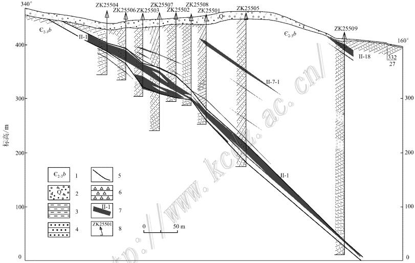 图 3弄屯铅锌矿床255号勘探线剖面图(据广西壮族自治区第四地质队,2013修改) 1—第四系松散沉积物; 2—中、上寒武统边溪组砂岩、粉砂岩、泥岩; 3—泥岩; 4—砂 岩; 5—断层; 6—构造角砾岩; 7—矿体及编号; 8—钻孔及编号 Fig. 3Geological section along No 255 exploration line of the Nongtun Pb_Zn de posit (modified after No. 4 Geological Party of Guangxi, 2013) 1—Quaternary loose sediments; 2—Middle_Upper Cambrian Bianxi Formation sandsto ne, siltstone and mudstone; 3—Mudstone; 4—Sandstone; 5—Fault; 6—Tectonic b reccia; 7—Orebody and its serial number; 8—Drill hole and its serial number |