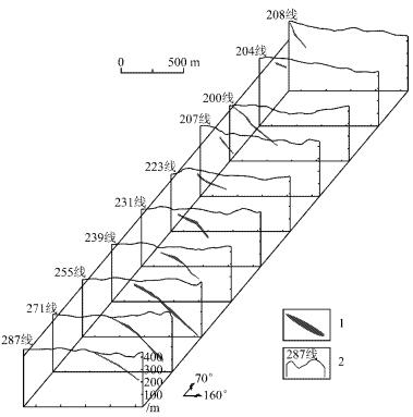 图 4弄屯铅锌矿床勘探线联合剖面图 1—铅锌矿体; 2—勘探线及编号 Fig. 4The combined profile of exploration lines in the Nongtun Pb_Zn deposit 1—Pb_Zn orebody; 2—Exploration line and its serial number |