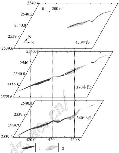 尽管研究区内控制矿体的断裂走向既有NE向,也有EW向,但是由钻探工程揭露的情况可以发 现,矿体沿倾向具有一致的变化规律,即在浅部断裂产状较缓部位,矿体厚度较大,向深部 断裂产状变陡,矿体厚度减薄直至尖灭。