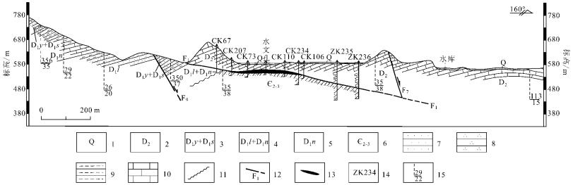 图 6长屯铅锌矿床F1断裂地质剖面图(据广西壮族自治区第四地质队,1982修改) 1—第四系松散沉积物; 2—中泥盆统灰岩; 3—下泥盆统郁江组、四排组砂岩、粉砂岩、 页岩; 4—下泥盆统那高岭组灰岩、砂质泥岩、页岩; 5—下泥盆统莲花山组、那 高岭组砂 岩、粉砂岩、泥岩; 6—中、上寒武统砂岩、粉砂岩、泥岩; 7—砂岩; 8—粉砂岩; 9 —泥岩; 10—灰岩; 11—角度不整合; 12—断裂及编号; 13—铅锌矿体; 14 —钻孔及编号; 15—地层产状 Fig. 6 Geological section of F1 fault of the Changtun Pb-Zn deposit (modified after No. 4 Geological Party of Guangxi, 1982) 1—Quaternary loose sediments; 2—Middle Devonian limestone; 3—Lower Devonian Y ujiang Formation, Sipai Formation sandstone, siltstone and shale; 4—Lower Devon ian Nagaoling Formation limestone, arenaceous mudstone and shale; 5—Lower Devon ian Lianhuashan Formation, Nagao_ ling Formation sandstone, siltstone and mudstone ; 6—Middle-Upper Cambrian sandstone, siltstone and mudstone; 7—Sandstone; 8— Siltstone; 9—Mudstone; 10—Limestone; 11—Unconformity; 12—Fault and i ts serial number; 13—Pb-Zn orebody; 14—Drill hole and its serial number; 15—Attitude of strata |