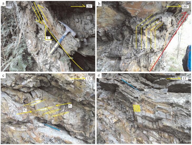 图 7F16断裂中的小构造 a. F16断裂面特征; b. F16断裂上盘牵引褶皱; c. F16断裂上盘雁列 状石英脉; d. F16断裂上盘劈理 Fig. 7Small structures in F16 fault a. Characteristics of F16 fault plane; b. Traction folds on the hanging wa ll of F16 fault; c. En echelon quartz veins on the hanging wall of F 16 fault; d. Cleavage on the hanging wall of F16 fault |
