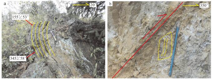 图 8F18断裂中的小构造 a. F18断裂带下盘牵引褶皱; b. F18断裂带中构造透镜体 Fig. 8Small structures in F18 fault a. Traction folds on the footwall of F18 fault; b. Tectonic lens in F1 8 fault |