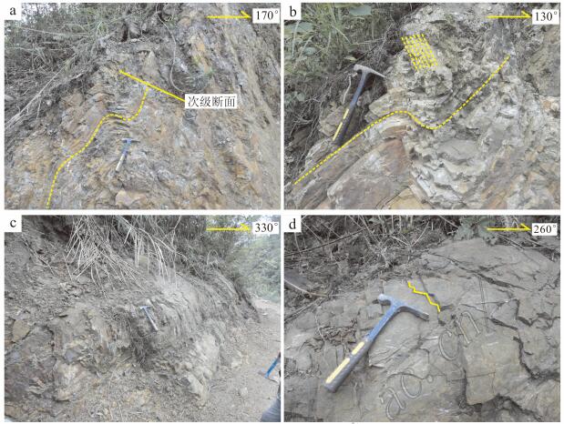 图 9F21断裂中的小构造 a. F21断裂带下盘牵引褶皱及次级断裂面; b. 牵引褶皱中发育的轴面劈理; c. 牵 引褶皱中波状起伏的层理面; d. 发育在层理面上的 追踪张节理 Fig. 9Small structures in F21 fault a. Traction folds and secondary fracture plane on the footwall of F21 faul t; b. Axial_plane cleavage in traction folds; c. Undulating bedding plane in tractio n folds; d. Trace tension joint in the bedding plane |