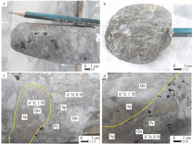 图 10F4断裂带中矿化角砾岩的特征 a. 磨圆的角砾具有明显的定向性; b. 含有闪锌矿的椭圆状石英角砾; c、d. 含有闪锌矿 、石英的矿石(矿化Ⅰ期)被黄铁矿、闪锌矿(矿化Ⅱ期)胶结 Qtz—石英; Sp—闪锌矿; Py—黄铁矿 Fig. 10Characteristics of mineralized breccia in F4 fault a. Rounded breccia with obvious orientation; b. Oval quartz breccia containing s phalerite; c, d. An ore breccia containing sphalerite and quartz (Phase Ⅰ min eralization) cemented with pyrite and sphalerite (Phase Ⅱ mineralization) Qtz—Quartz; Sp—Sphalerite; Py—Pyrite |