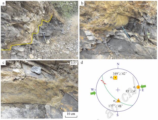 图 11成矿后近东西向挤压应力作用证据 a、b、c. 沿寒武系砂岩层理和节理发育的波状起伏的断层; d. 断层主应力分析赤平投影 图 Fig. 11Evidence for the effect of near EW_trending compressive stress after mi neralization a, b, c. Wavy undulating fault plane developed along the bedding and joints of C ambrian sandstone; d. Stereographic map of fault principal stress analysis |