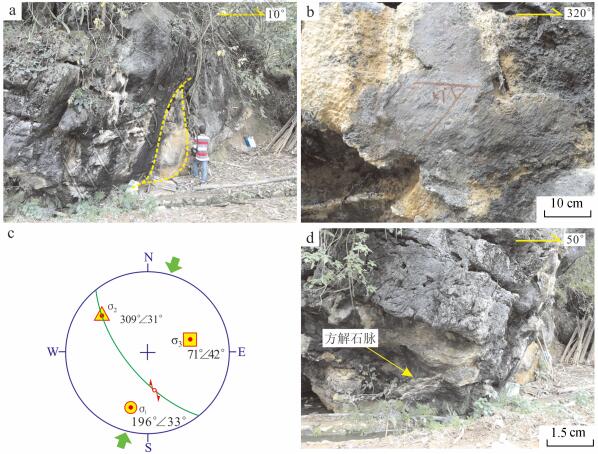 在谷山水库沟口,F1断裂出露较好,可以见到2个明显的断裂滑动面。构造观察点位置见 图2 点G5。其中,主断裂面较平直,产状190°∠34°,次级断裂面产状230°∠72°。断层下盘 为寒武系砂岩,岩石较破碎,上盘为泥盆系灰岩。在2个断裂面之间发育有一个大型的灰岩 构造透镜体(图12a),透镜体长约2.5 m,宽约0.6 m。根据透镜体的排列方式,确定该 断 层为逆断层。在次级断裂面上发育有一组擦痕及阶步,擦痕向东侧伏,侧伏角57°(图12b )。根据擦痕及阶步的特征,判断该断层为逆断层。利用赤平投影进行主应力分析,其3个 轴的主应力方位分别为σ1: 196°∠33°,σ2: 309°∠31°,σ3: 71°∠42° (图12c) ,表明该断裂是受近南北向(NNE_SSW)的挤压应力作用下形成的。同时,在断层上盘的灰 岩中发育有一组由方解石充填的张节理(图12d),其产状为190°∠20°。