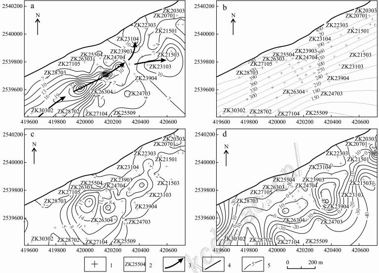 图 13弄屯铅锌矿床主矿体水平投影图 a. Zn/Pb比值等值线图; b. 矿体底板等高线图; c. 矿体厚度等值线图; d. 矿体底板标 高一次趋势剩余值等值线图 1—钻孔位置; 2—钻孔编号; 3—矿液流向; 4—矿体地表出露界线; 5—等值线 Fig. 13Horizontal projection of the main orebody of the Nongtun Pb_Zn deposit a. Zn/Pb ratio contour map; b. Contour map of orebody footwall; c. Contour map o f orebody thickness; d. Contour map of residual value of linear trend surface of orebody footwall 1—Location of drill hole; 2—Serial number of drill hole; 3—Flow direction of ore fluid; 4—Surface boundary of orebody; 5—Contour line |
