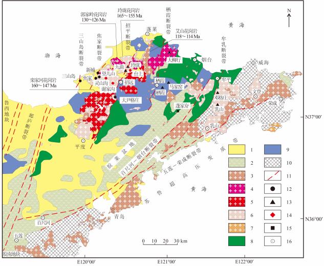图 1胶东区域地质及主要金矿分布图(据Wang et al.,1998;Fan et al.,2003;陈衍 景等,2004;Goss et al.,2010; Yang et al.,2012;Yang et al.,2014) 1—第四系; 2—早白垩世火山岩; 3—艾山花岗岩; 4—郭家岭花岗岩; 5—栾家河花岗 岩; 6—玲珑花岗岩; 7—晚三叠世花岗岩; 8—元古 代变质岩; 9—太古代变质 岩; 10 —超高压变质岩; 11—主要断裂; 12—蚀变岩型金矿床; 13—石英脉型金矿床; 14—过 渡型金矿床; 15—滑动角砾岩型金矿床; 16—城市 Fig. 1Simplified geological map of the Jiaodong Peninsula showing locations of the major gold deposits (after Wang et al.,1998; Fan et al.,2003; Chen e t al.,2004; Goss et al.,2010; Yang et al.,2012; Yang et al.,2014) 1—Quaternary; 2—Early Cretaceous volcanic rock; 3—Aishan granite; 4—Guoj ialing granite; 5—Luanjiahe granite; 6—Linglong granite; 7—Late Tr iassic g ranite; 8—Proterozoic metamorphic rock; 9—Archean metamorphic rock; 10—UHP metamorphic rock; 11—Main fault; 12—Altered rock type gold deposit; 13— Quartz vein type gold deposit; 14—Transitional type gold deposit; 15—Interla yer slide breccia type gold deposit; 16—City |