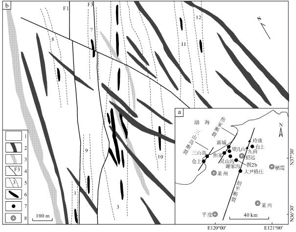 图 2胶西北构造背景图(a)和谢家沟金矿矿体分布图(b)(据王建国等,2009) 1—玲珑花岗岩; 2—中基性脉岩; 3—硫铁矿带; 4—断层及编号; 5—蚀变带及编号; 6—金矿体; 7—金矿床; 8—城市 Fig. 2Geotectonic map of northwestern Jiaodong peninsula (a) and distributio n of orebody in the Xiejiagou gold deposit (b) (After Wang et al., 2009) 1—Linglong granite; 2—Intermediate_basic dikes; 3—Pyrite zone; 4—Fault an d its serial number; 5—Alteration zone and its serial number; 6—Gold ore b ody; 7—Gold deposit; 8—City |