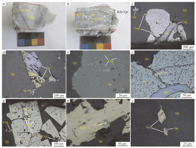 图 3谢家沟金矿床含金石英脉及其金的赋存状态 a. 第Ⅱ阶段石英脉; b. 第Ⅲ阶段石英脉; c. 方铅矿、黄铜矿溶蚀交代黄铁矿; d. 方 铅矿、黄铜矿、闪锌矿充填于石英颗粒间隙; e. 闪锌矿 中乳滴状黄铜矿固溶体; f. 黄铁 矿裂隙中方铅矿及银金矿; g. 黄铁矿中包体金及晶隙金; h. 黄铜矿中包体金; i. 石英 颗粒间晶隙金 Au—自然金、银金矿; Ccp—黄铜矿; Gn—方铅矿; Kfs—钾长石; Py—黄铁矿; Qz— 石英; Sp—闪锌矿 Fig. 3Au_bearing quartz vein and gold occurrence from the Xiejiagou gold depos it a. Quartz vein in stage Ⅱ; b. Quartz vein in stage Ⅲ; c. Metasomatic dissolu tion of pyrite by galena and chalcopyrite; d. Galena,chalcopyrite,sphalerite filling clearance between quartz grains; e. Droplets chalcopyrite solid solutio n in sphalerite; f. Galena and electrum in the fissure of pyrite; g. I nclusion gold and intercrystalline gold in pyrite; h. Inclusion gold in chalcopyrite; i. Intercrystalline gold in quartz Au—Native gold or electrum; Ccp—Chalcopyrite; Gn—Galena; Kfs—K_feldspar; Py—Pyrite; Qz—Quartz; Sp—Sphalerite |