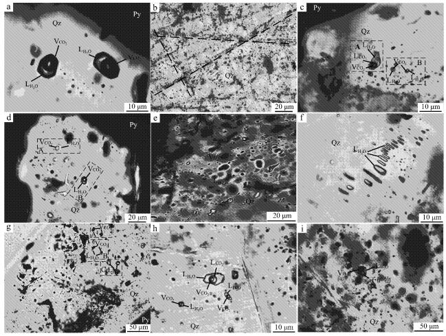 图 4谢家沟金矿床的流体包裹体显微照片 a. 主成矿期石英中原生流体包裹体; b. 第Ⅰ阶段石英裂隙中的次生流体包裹体; c. 第 Ⅰ阶段石英中富CO2三相流体包裹体(c_A)和富CO2两相流体包裹体(c_B); d. 主成 矿期含金黄铁矿包裹的石英中的富CO2两相流体包裹体(d_A、d_B); e. 主成矿期石英 中H2O溶液包裹体; f. 石英中纯液相流体包裹体; g. 主成矿期石英中纯CO2气相包裹 体(g_A)、富CO2两相包裹体(g_B)和纯液相流体包裹体(g_C); h. 主 成矿 期石英中富CO2三相和两相流体包裹体;i. 石英中含子矿物流体包裹体 Py—黄铁矿; Qz—石英; LCO2—液相二氧化碳; VCO2—气相二氧化碳 ; LH2O—液相水; VH2O—气相水 Fig. 4Photomicrographs of fluid inclusions from the Xiejiagou gold deposit a. Primary fluid inclusions in the main metallogenic stage quartz from the Xieji agou gold deposit;b. Secondary fluid inclusions in the fissure of Ⅰ stage quar tz; c. CO2_rich three_phase(c_A) and two_phase (c_B) fluid inclusions in Ⅰ stage quartz; d. CO2_rich two_phase fluid inclusions (d_A, d_B)in the Au _bearing pyrite of main metallogenic stage; e. Aqueous inclusion in the quartz of main metallogenic stage; f. Pure H2O liquid inclusions in the quar tz; g. Pure CO2 gaseous inclusions(g_A), CO2_rich two_phase fluid inclusions(g_ B) and pure H2O liquid inclusions(g_C) in the quartz of main metall ogenic stage; h. CO2_rich three_phase and two_phase fluid inclusions in the quartz of main metallogenic stage; i. Daughter mineral bearing fluid inclusi on in the quartz Py—Pyrite; Qz—Quartz; LCO2—Carbon dioxide of liquid phase; VCO 2—Carbon dioxide of vapor phase; LH2O—Water of liquid phase; VH2O—Water of vapor phase |