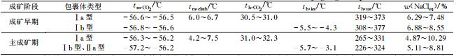 注: tm,CO2为固相CO2的熔化温度;tm,clath为笼合物的融化温 度; th,CO2为CO2的部分均一温度;th,ice为冰点温度;th, tot为完全均一温度;w(NaCleq)为盐度。