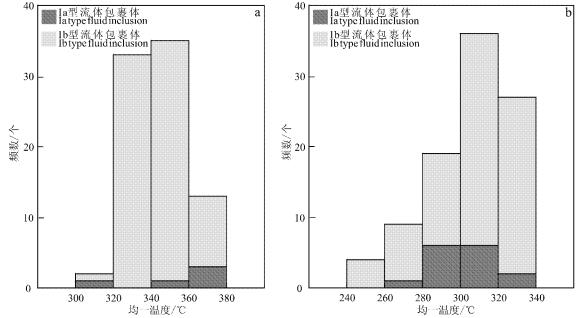 图 5谢家沟金矿床不同成矿阶段流体包裹体均一温度直方图 a. 成矿早期流体包裹体均一温度直方图; b. 主成矿期流体包裹体均一温度直方图 Fig. 5Histograms showing total homogenization temperature of different stages of fluid inclusions from the Xiejiagou gold deposit a. Histogram showing total homogenization temperature of early metallogenic stag e fluid inclusions;b. Histogram showing total homogenization temperature of m ain metallogenic stage fluid inclusions |