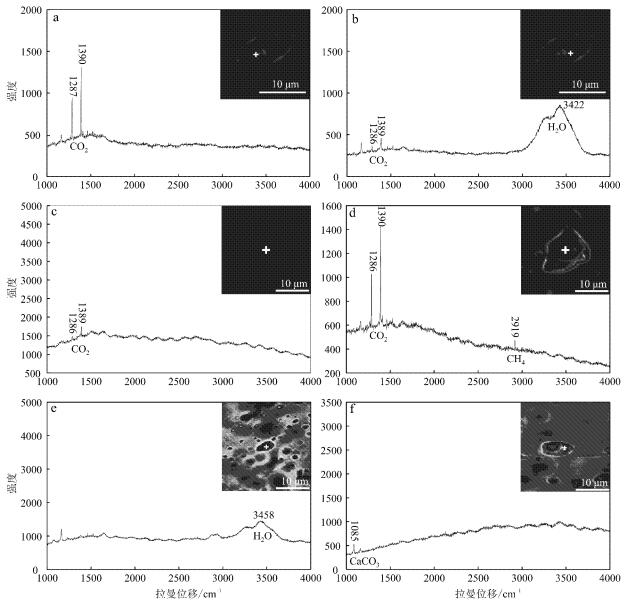 主成矿期部分LH2O_VCO2型(Ⅰb型)流体包裹体中气相的激光拉曼光谱出 现了CO2和CH4特征峰(图6d),表明主成矿期的成矿流体中有CH4的加入,这与主成 矿期部分流体包裹体的 固 态CO2的熔化温度略低于纯CO2的三相点的显微测温结果相一致。LH2O_VH 2O型(Ⅱa型)流体包 裹体中的气相部分只出现了气相H2O的特征峰(图6e),并无CO2的特征峰出现。成矿晚 期流体包裹体中偶见碳酸钙子矿物(图6f)。