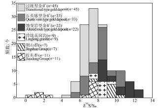 谢家沟金矿床主成矿期黄铁矿的δ34S值变化范围在5.9‰~7.8‰,平均值为6.7 ‰,接近胶 东灵山沟金矿床(成矿期黄铁矿的δ34S值变化范围在5.3‰~8.3‰,平均值为7. 0‰)和台上金矿床(成矿期黄铁矿的δ34S值变化范围在4.5‰~8.0‰,平均 值为6.8‰),略低于胶东典型的石英脉型金矿床,明显低于胶东典型的蚀变岩型金矿床(图7)。胶东地区硫同位素组成分布范围集中,且与太 古代胶东群、玲珑花岗岩、郭家岭花岗岩以及中基性脉岩相似。
