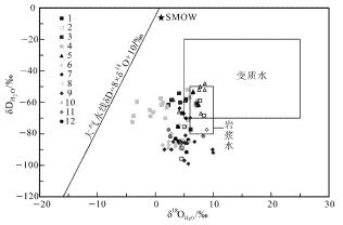 图 8谢家沟及胶东典型金矿δ18OH2O_δD关系图解 (底图据Taylor,1974;Hoefs,2009;同位素数据引自杨敏之等,1996;毛景文等,2005; 辛洪波,2005;孙莉,2006;姜晓辉 等,2011;郭林楠等,2014;Yang et al.,2 016) 1—焦家金矿早期; 2—焦家金矿主成矿期; 3—望儿山金矿早期; 4—望儿山金矿主成矿 期; 5—三山岛金矿早期; 6—三山岛金矿主成矿期; 7—玲珑金矿早期; 8—玲珑金矿主 成矿期; 9—台上金矿早期; 10—台上金矿主成矿期; 11—灵山沟金矿早期及主成矿 期; 12—谢家沟金矿早期及主成矿期 Fig. 8 Diagram showing δ18OH2O versus δD of Xiejiagou an d different types of gold deposits in Jiaodong peninsula (base map after Taylor ,1974;Hoefs,2009;isotope data after Yang et al.,1996;Mao et al.,2005;Xin et al.,2005;Sun et al., 2006;Jiang et al.,2011;Guo et al.,2014;Y ang et al., 2016) 1—Early stage of Jiaojia gold deposit; 2—Main mineralization stage of Jiaojia go ld deposit; 3—Early stage of Wangershan gold deposit; 4—Main mineralization stag e of Wangershan gold deposit; 5—Early stage of Sanshandao gold deposit; 6—Ma in m ineralization stage of Sanshandao gold deposit; 7—Early stage of Linglong gold d eposit; 8—Main mineralization stage of Linglong gold deposit; 9—Early stage of T aishang gold deposit; 10—Main mineralization stage of Taishang gold deposit; 11— Early stage/Main mineralization stage of Lingshangou gold deposit; 12—Early st age/main mineralization stage of Xiejiagou gold deposit |