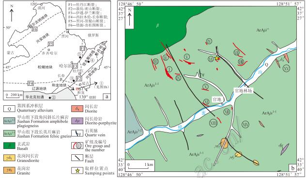 官地铁矿床位于华北克拉通北缘与兴蒙造山带东段接合带附近的和龙地块内(图1a)。呈北 西向展布的鞍山群是区内时代最老、分布最广的地层,构成和龙地块结晶基底,自下而上可 分为鸡南组、百日坪组与甲山组。其中,甲山组下段长英片麻岩层是官地铁矿区内的主要含 矿地层,其主要岩性为角闪长英片麻岩、长英片麻岩,局部夹斜长角闪片岩、变粒岩(浅粒 岩)、磁铁石英岩等。矿区内北北西向大断裂和南西向小断裂较发育,多对矿体具有明显的 破坏作用。矿体主要出露于大型向斜的核、翼交汇处,故褶皱构造与矿体形成有密 切联系。区内岩浆活动较弱,多以花岗岩、闪长岩等脉岩为主,穿切区内主要含矿层位(图 1b)。