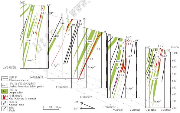 图 2官地矿区Ⅰ号矿组联合剖面图(剖面底图据吉林省有色金属地质勘查局603队,2013 修改) Fig. 2Combined profiles of ore group Ⅰ of the Guandi iron deposit (base map a fter No. 603 Geological Party, Jilin Nonferrous Metal Geological Exploration B ureau, 2013) |