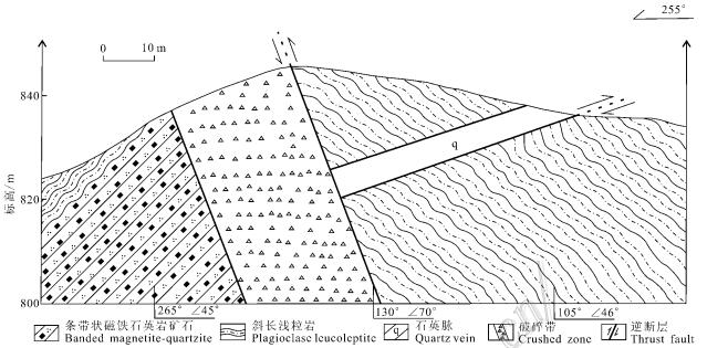 矿石类型主要为条带状磁铁石英岩矿石,其次为块状磁铁角闪岩矿石。条带状磁铁石英岩中 的硅质层主要由石英组成,含少量的磁铁矿,层宽2~3 mm;铁质层主要由磁铁矿和少量石 英、 角闪石组成(图4a、c)。块状磁铁角闪岩主要由角闪石、磁铁矿和少量石英组成,其中角 闪石含量约为45%(图4b)。
