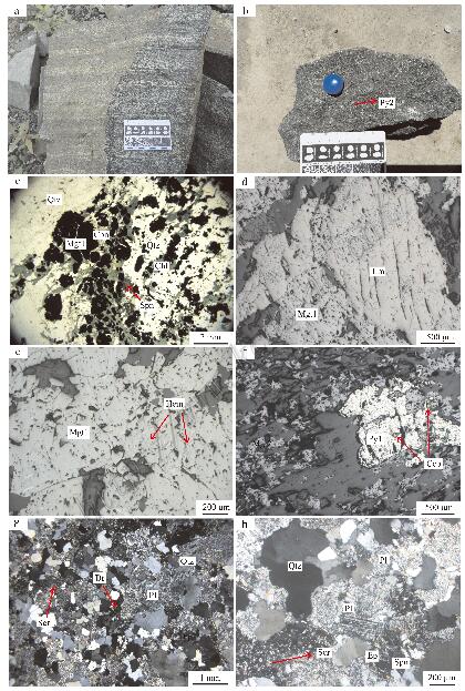 图 4官地铁矿矿石手标本和显微矿化特征以及斜长浅粒岩显微特征 a. 条带状铁矿石; b. 块状铁矿石; c. 条带状铁矿石主要由磁铁矿和石英组成(-); d. 铁矿石中发育早世代磁铁矿和钛铁矿(-);e. 铁矿石中发育早世代磁铁矿和赤铁矿(-); f. 铁矿石中发育早世代黄铁矿、晚世代磁 铁矿和黄铜矿(-); g. 斜长浅粒岩粒状变晶结构(+); h. 斜长浅粒岩主要由斜长石 和石英组成(+) Mgt1—早世代磁铁矿; Ilm—钛铁矿; Hem—赤铁矿; Py1—早世代黄铁矿; Mgt2—晚世 代磁铁矿; Py2—晚世代黄铁矿; Ccp—黄铜矿; Pl—斜长石; Qtz—石英; Bt—黑云 母; Ep—绿帘石; Chl—绿泥石; Cbn—碳酸盐; Ser—绢云母; Spn—榍石 Fig. 4Hand specimens and photomicrograph of iron ore and plagioclase leucolept ite from the Guandi iron deposit a. Banded iron formation (BIF); b. Massive ore; c. Magnetite and quartz comprisi ng the dominating compositions of BIF (-); d. Early magnetite and ilmenite in ma gnetite ore (-); e. Early magnetite and hematite in magnetite ore (-); f. Early pyrite, late magnetite and chalcopyrite in magnetite ore (-); g. Granular blasti c texture of plagioclase leucoleptite (+); h. Plagioclase leucoleptite mainly co mposed of plagioclase and quartz (+) Mgt1—Early magnetite; Ilm—Ilmenite; Hem—Hematite; Py1—Early pyrite; Mgt2—La te magnetite; Py2—Late pyrite; Ccp—Chalcopyrite; Pl—Plagioclase; Qtz —Quartz; Bt—Biotite; Ep—Epidote; Chl—Chlorite; Cbn—Carbonate; Ser—Sericite; Spn—Sp hene |