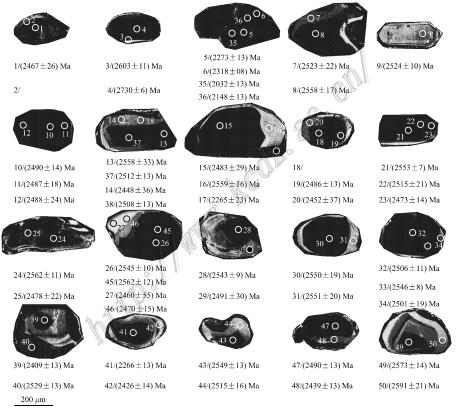 锆石阴极发光(CL)图像分析发现(图5),锆石颗粒边部较为圆滑,长度约为250~480 μ m,宽度约为120~280 μm,长宽比为3∶2~5∶2,多为长粒状形态,部分为椭圆状,核边 结构明显。结合锆石阴极发光(CL)图像(图5)以及U_Pb谐和年龄(图6a~c),除去极不谐和的8组 数 据,锆石207Pb/206Pb年龄可分为4组(图6a~c): ①(2730±6) Ma,测点14GDP2_1_04,位于锆石核部,CL图像较暗,应属捕获岩浆锆石; ② 2591~2409 Ma,26个 测点,位于锆石核部,CL图像较暗,多具微弱环带,且根据锆石中富集重稀土元素的特征判 断(图6e), 应为岩浆成因, 上交点年龄为 (2551±44) Ma(MSWD=0.37); ③ 2551~2426 Ma,13个测点,位于锆石边部,CL图像较亮,无分带或 弱分带,应为变质成因锆石,上交点年龄为( 2525±48) Ma(MSWD =0.16); ④ (2318±8) Ma和(2265±23) Ma,测点14GDP2_1_ 0 6和14GDP2_1_17,位于锆石边部,CL图像较暗,无分带,且根据锆石中稀土元素分布相对平 坦的特征判断(图6e),应为后期变质增生锆石,投图位于年龄谐和曲线上,加权平均年龄 为(2312±210) Ma(MSWD=4.7)。